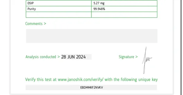 Description: DSIP, or delta sleep-inducing peptide, has been shown to aid in the quality of sleep. Please see attached COA for purity and analysis.